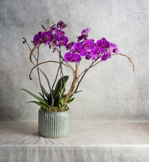 This sophisticated composition brings together two Phalaenopsis plants with deep, velvety purple flowers. Each carries two graceful flowering stems, offering a profusion of flowers in captivating shades. Nestled in an elegant, raised green ceramic cachepot, the bases are covered in plant moss, adding a neat, natural touch. Ideal for enhancing an interior with distinction, this plant combines lasting beauty with ease of care.